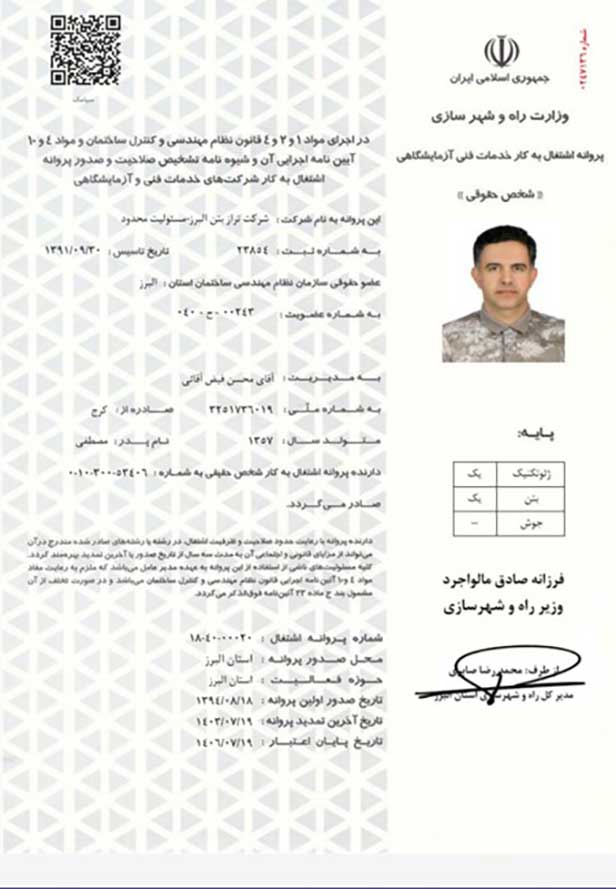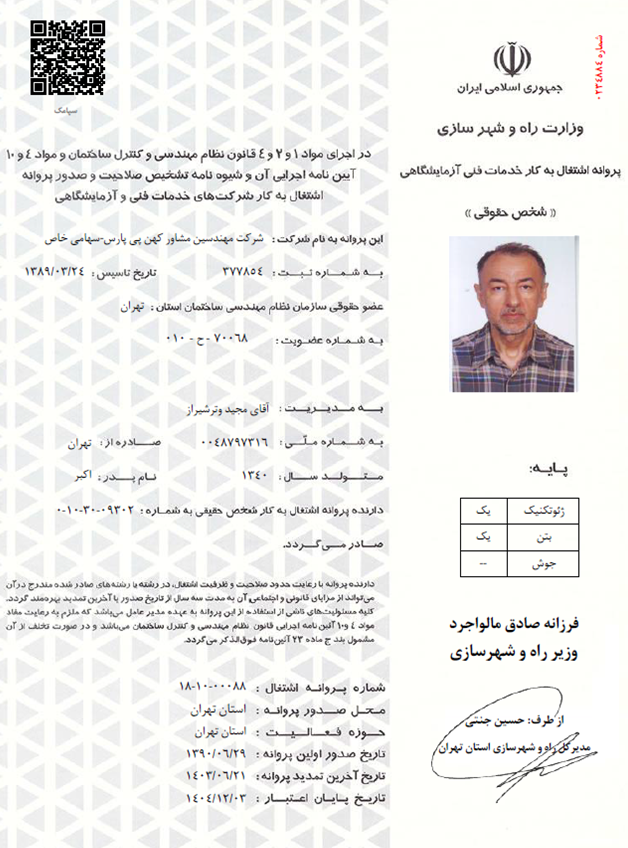 | 1398 | انجمن صنفی خدمات آزمایشگاهی | عضو فنی کارگروه ژئوتکنیک و ژئوفیزیک مجمع صنفی خدمات آزمایشگاهی استان البرز |